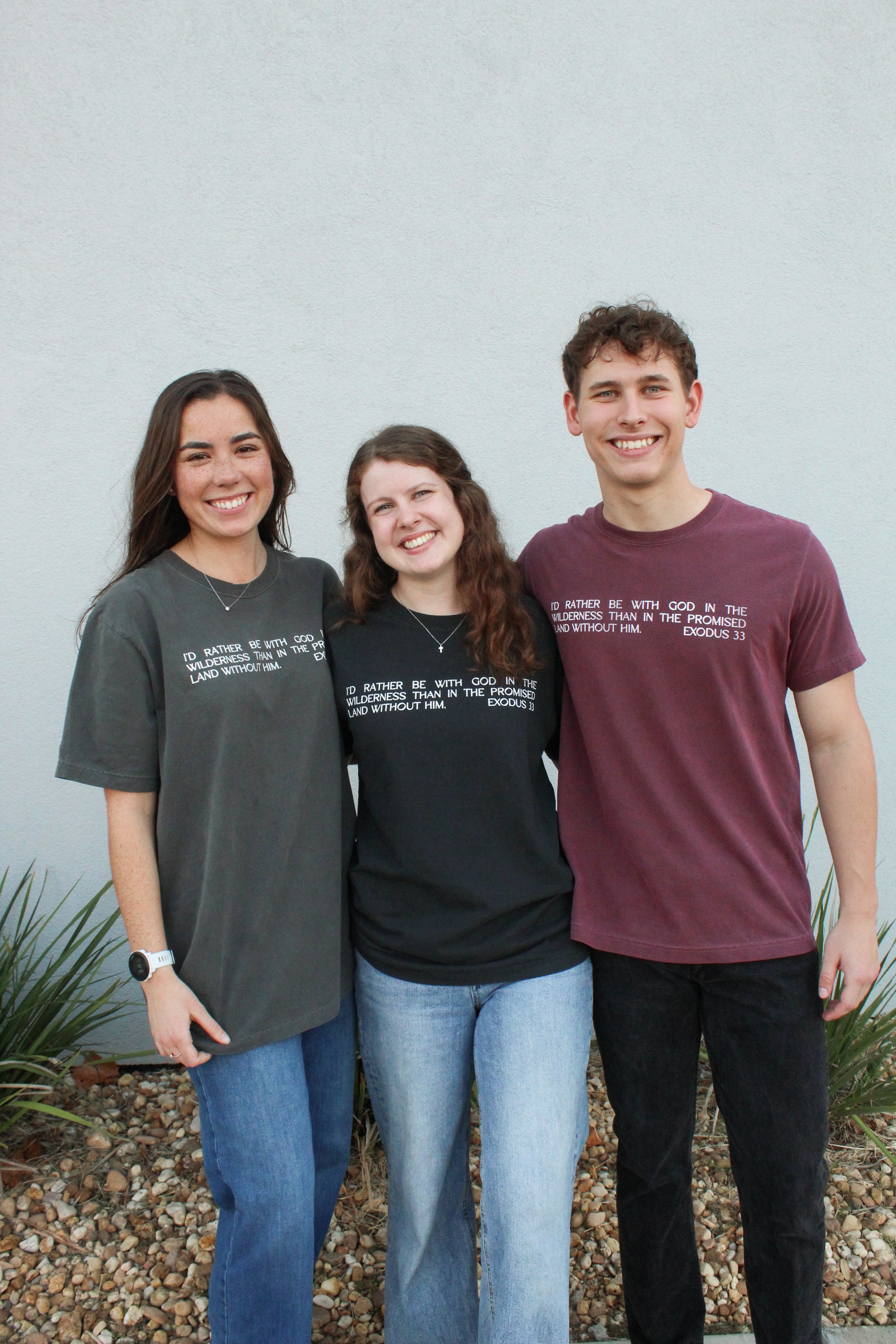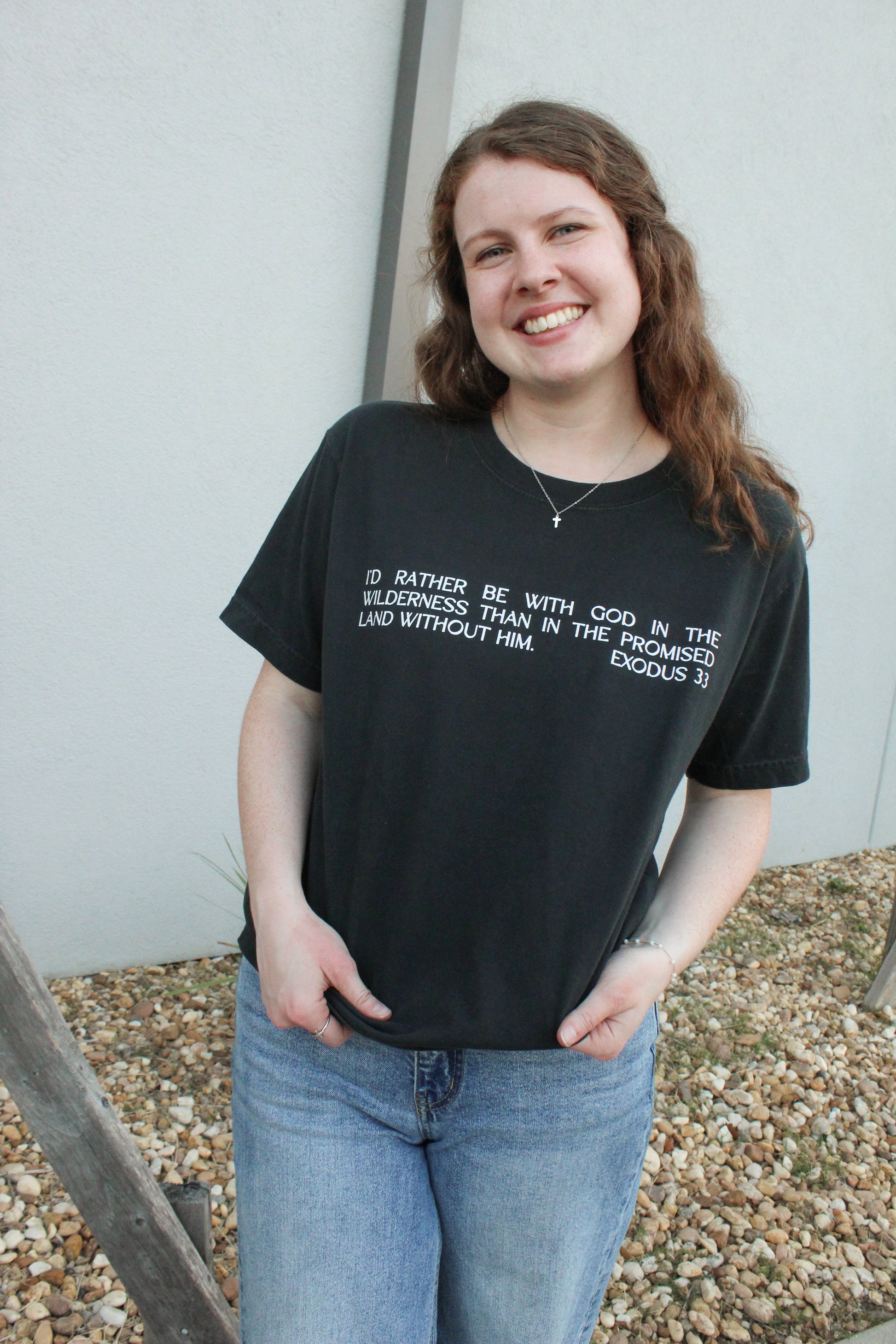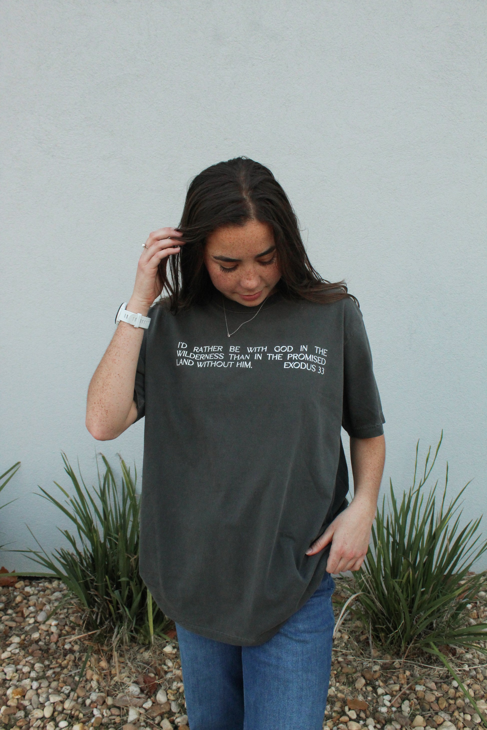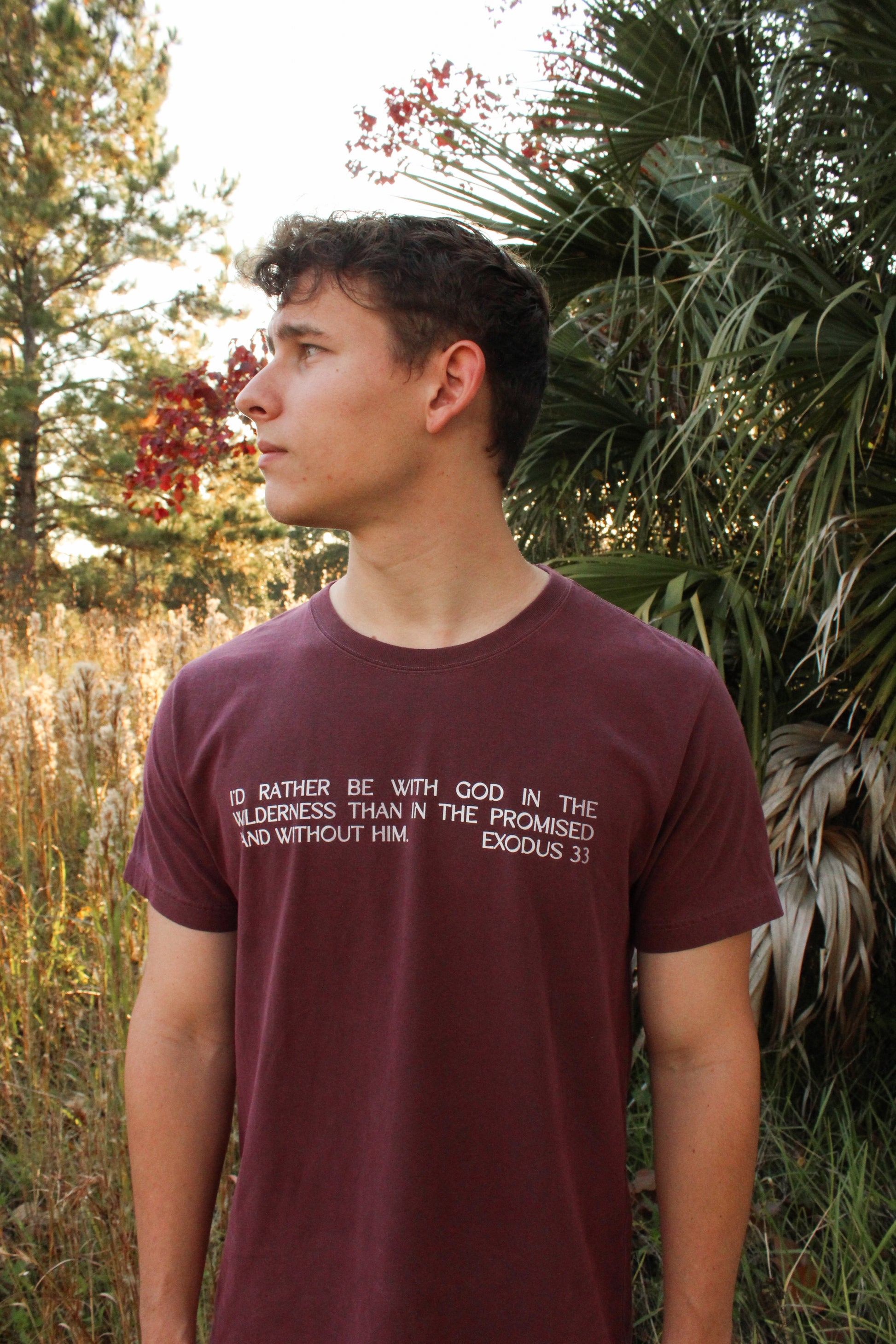 Inspired by Exodus 33, this tee makes the declaration that God's presence is what our hearts should desire more than anything else. God promised to lead His people to a land flowing with milk and honey, a beautiful and holy land for a people chosen and dearly loved by God. BUT they grew impatient with God and turned their hearts in worship towards something dead that seemed promising. So God, being ever-faithful to His promises, tells Moses: